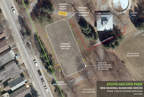 Pour la saison hivernale 2025-2026, on propose de mettre en place une patinoire pilote avec bandes afin de mesurer son utilisation et sa popularité. Pour la saison d’essai, on installera uniquement un service d’eau permanent, nécessaire pour soutenir l’exploitation de la patinoire avec bandes. Ce service d’eau consistera en une chambre des vannes souterraine avec une plaque de regard d’égout au niveau du sol et une canalisation d’incendie verticale pour raccorder le tuyau de la patinoire. Le reste de l’infrastructure de soutien serait temporaire et comprendrait la réutilisation et l’agrandissement des bandes de la patinoire Mutchmor, la mise en place d’une remorque pour disposer d’un vestiaire chauffé et d’un espace de rangement pour le tuyau, et de six luminaires, trois de chaque côté de la patinoire. Les bandes, la remorque et les luminaires seraient installés à la fin de l’automne et retirés au printemps. Le plan conceptuel ci-dessous montre l’emplacement où l’on propose d’installer la patinoire saisonnière et le service d’eau permanent, ainsi que l’infrastructure de soutien temporaire de la patinoire pour la saison d’essai 2025-2026.